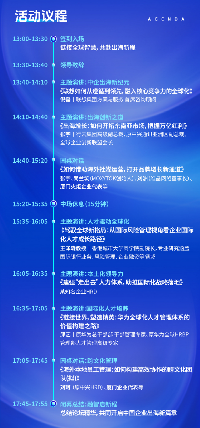 - 目标受众:企业董事长、总裁、总经理、首席运营官、海外业务负责人、人力资源总监等相关领域的高级管理人员。3.论坛议程