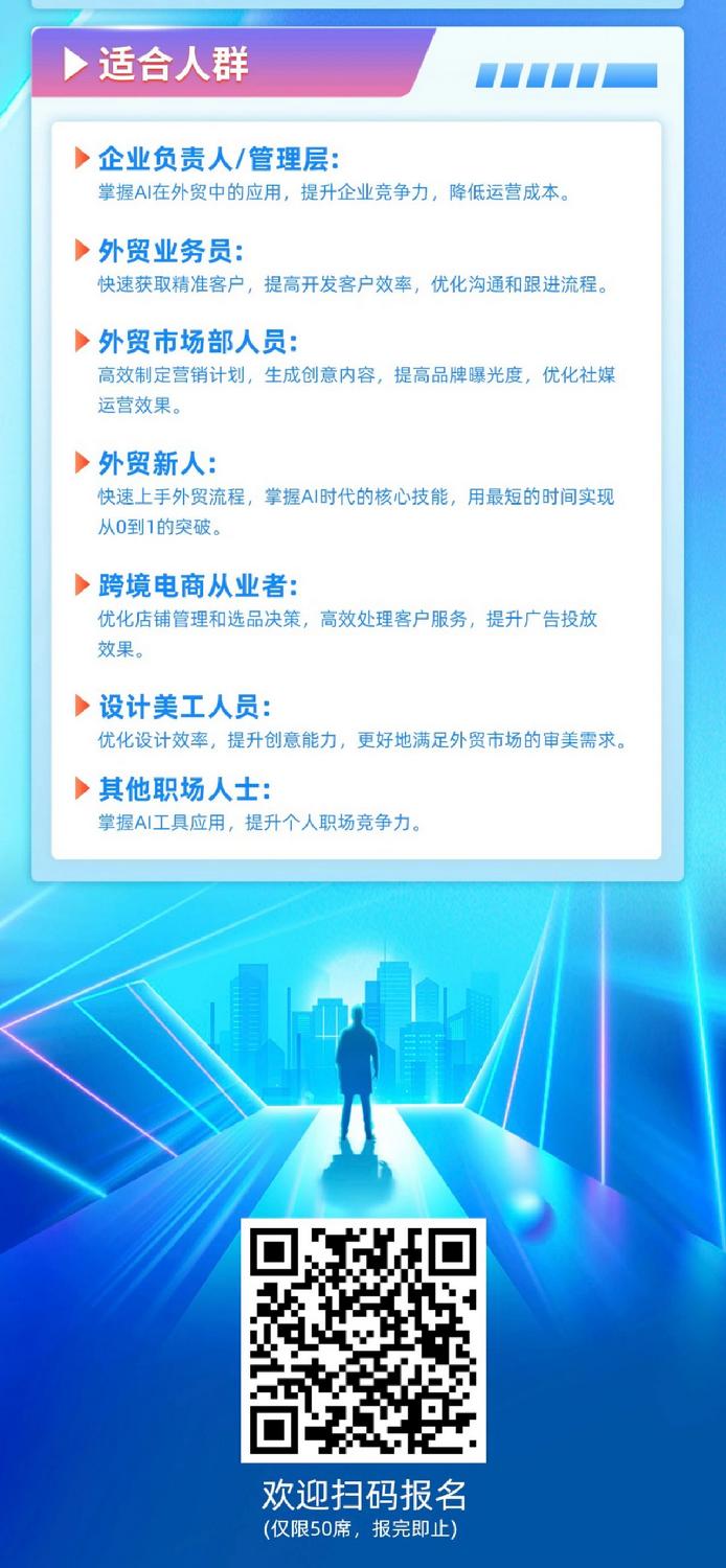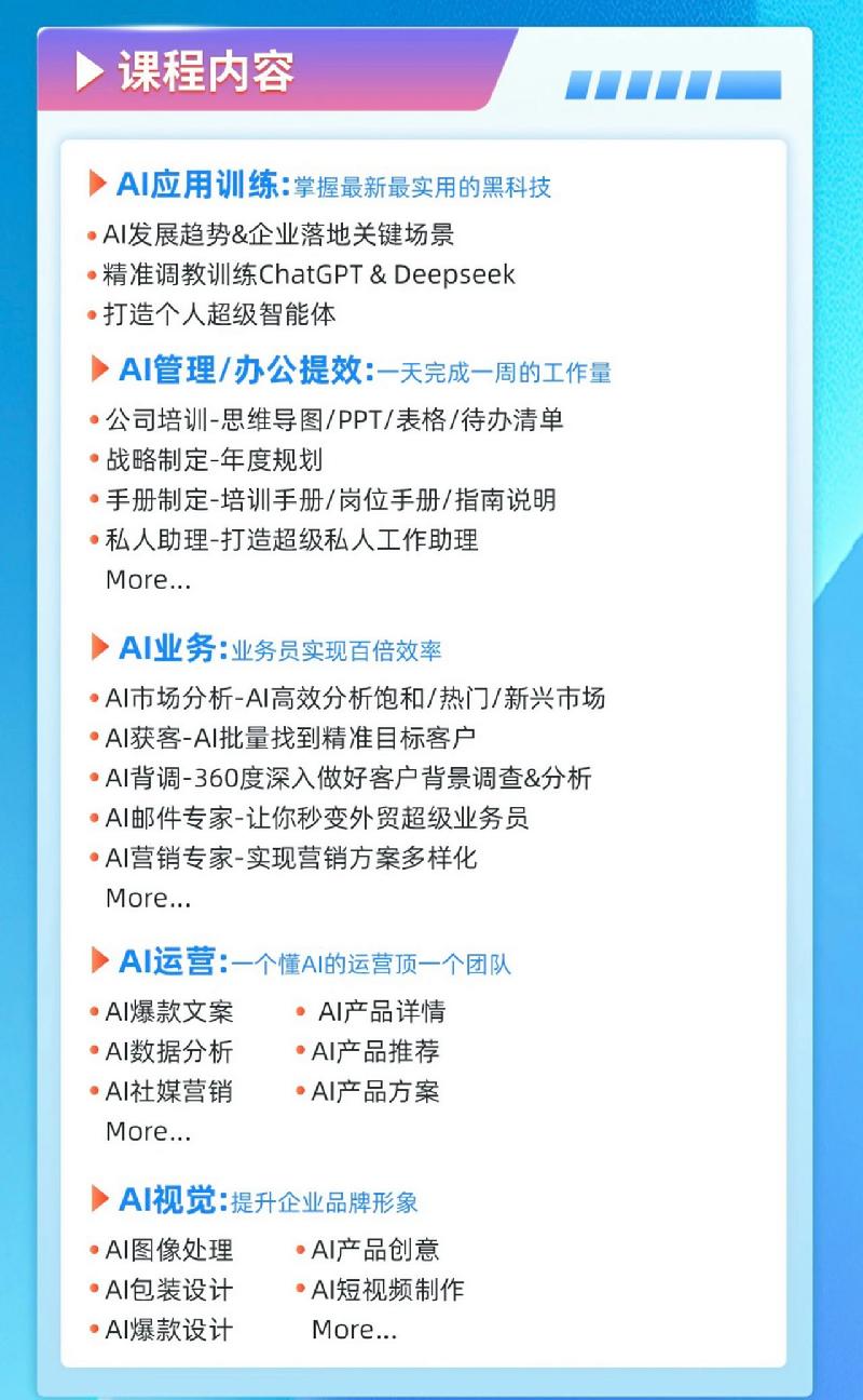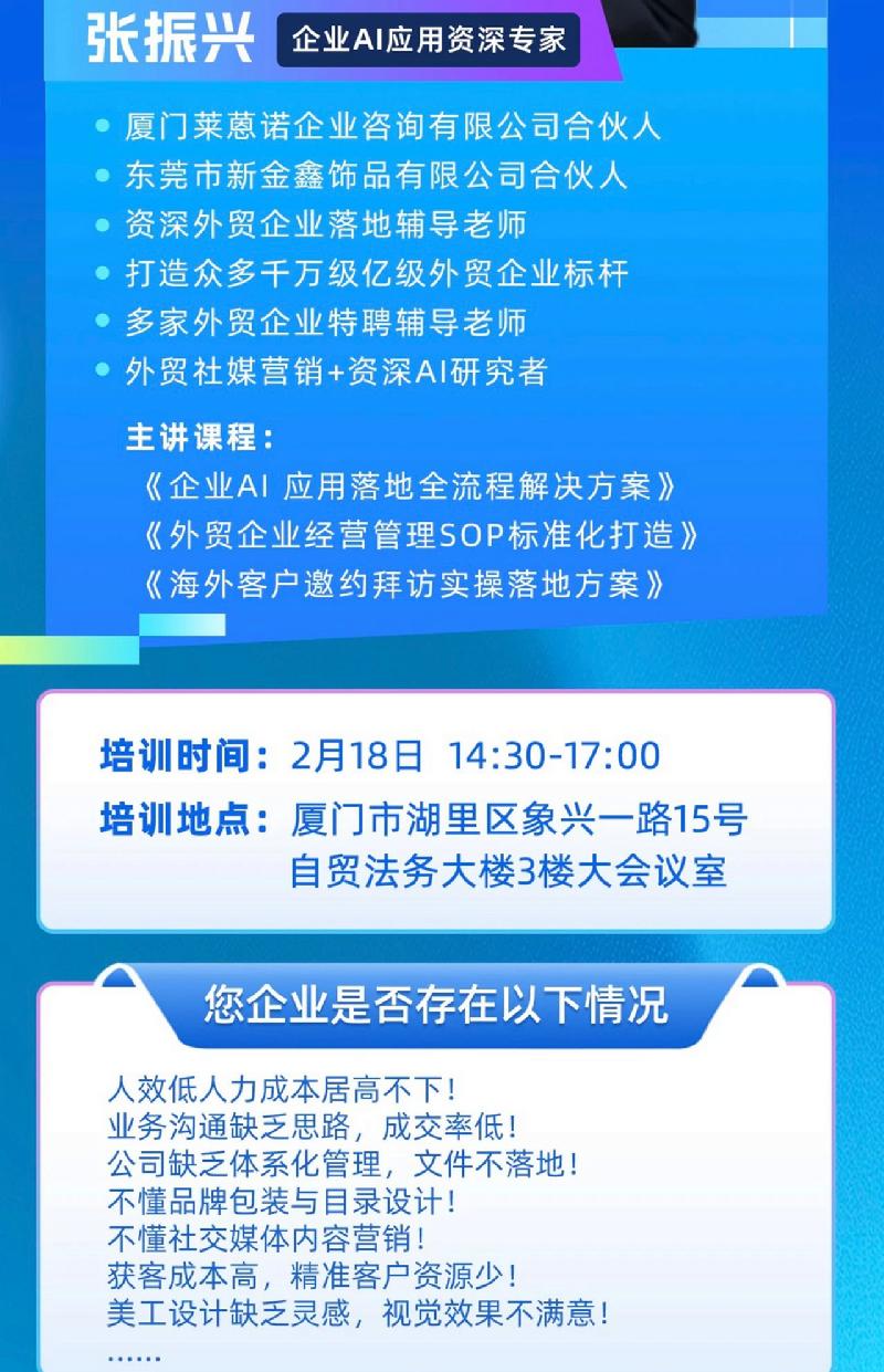 为了帮助企业更好地运用AI技术,厦门国际商会联合理事单位厦门川行会展会议服务有限公司特别策划了AI运用培训活动,旨在通过系统、全面的课程安排,快速掌握ChatGPT、DeepSeek等AI应用,提高办公效率,推动AI在各行业的创新应用。