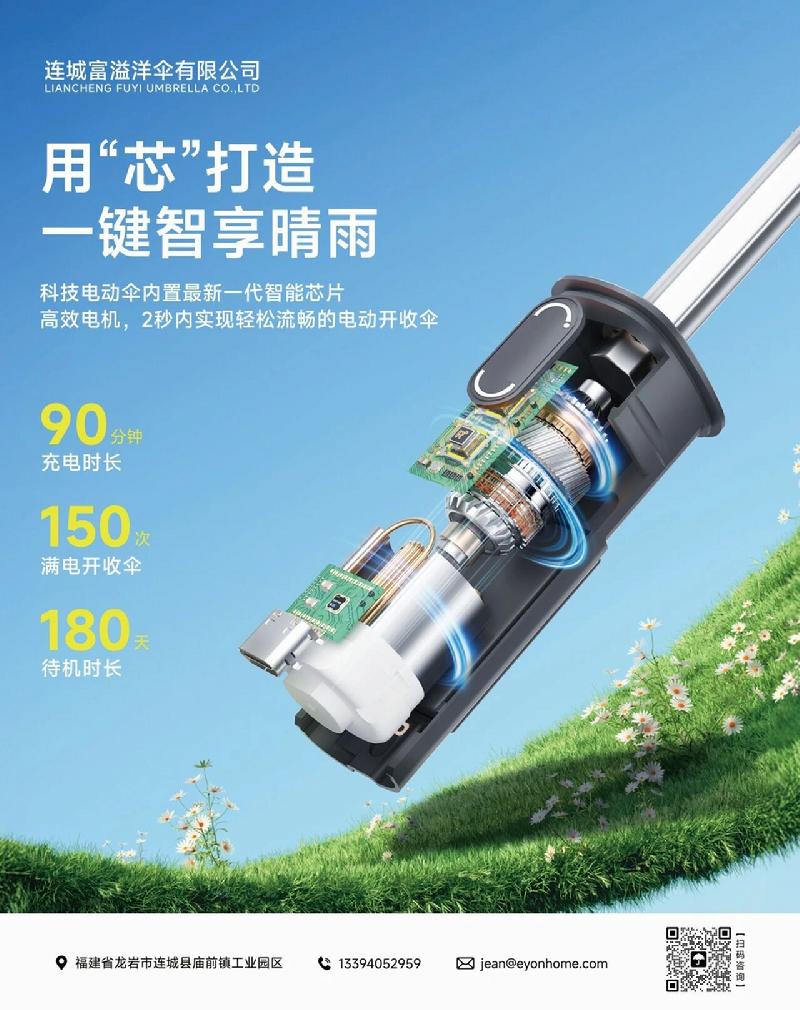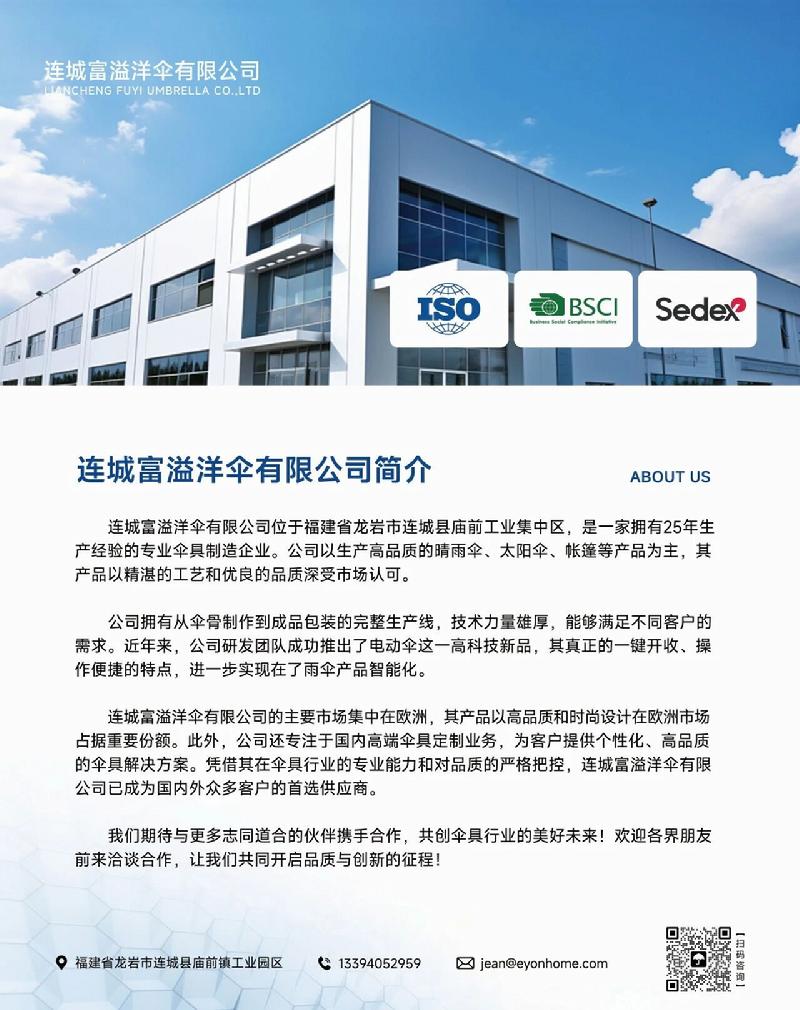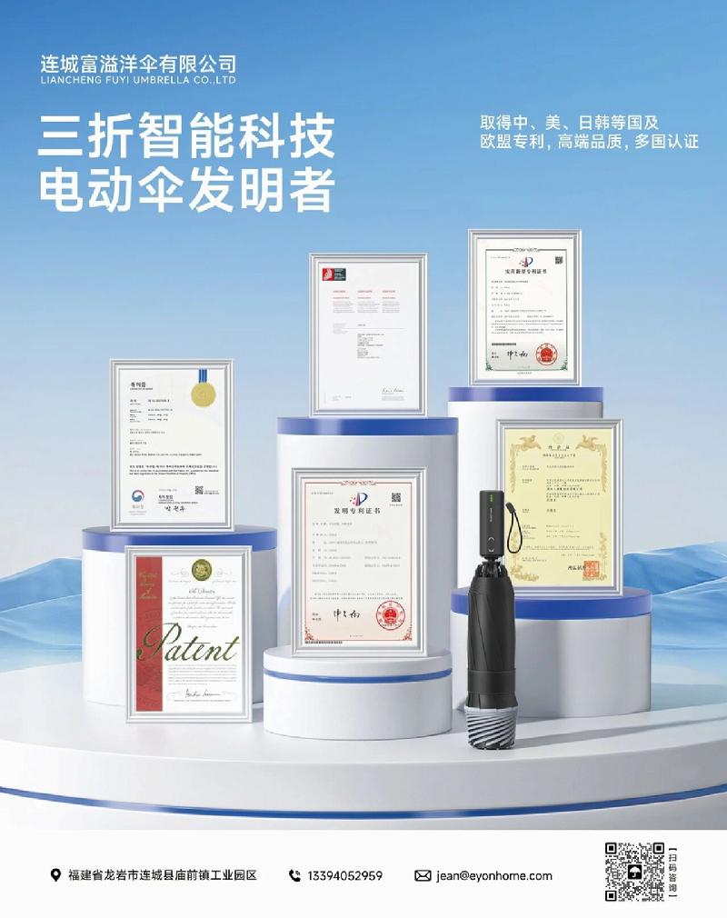 龙岩市展团 中跨展展团推介 龙岩是中国唯一一座以“龙”字命名的地级市,是全国著名革命老区、原中央苏区核心区,是客家祖地,资源禀赋好,森林覆盖率达79.21%,拥有“八大干”“八大珍”“八大鲜”等特色产品。本次龙岩展团将带着“高岩值”产品天团参展。 从“红军可乐”到新生代饮品,从“闽西八大干”到休闲小零食,从非遗产品到现代工艺品,“高岩值”产品与“中跨展”不期而遇,历史与现代在此交融、传统技艺与科技创新完美演绎。 本次参展的龙岩市企业涵盖了多个领域 包括酒类酿造、竹制品文创、非遗食品、医疗器械、生态农业、保健养生等 这些企业均具备较高的产品质量和市场竞争力 是龙岩市产业发展的中坚力量 即将共同展示龙岩市的产业魅力和创新实力 企业简介 5A56 连城富溢洋伞有限公司 连城富溢洋伞有限公司位于福建省龙岩市连城县庙前工业集中区,是一家拥有25年生产经验的专业伞具制造企业。公司以生产高品质的晴雨伞、太阳伞、帐篷等产品为主,其产品以精湛的工艺和优良的品质深受市场认可。 公司拥有从伞骨制作到成品包装的完整生产线,技术力量雄厚,能够满足不同客户的需求。近年来,公司研发团队成功推出了电动伞这一高科技新品,其真正的一键开收、操作便捷的特点,进一步实现在了雨伞产品智能化。 连城富溢洋伞有限公司的主要市场集中在欧洲,其产品以高品质和时尚设计在欧洲市场占据重要份额。此外,公司还专注于国内高端伞具定制业务,为客户提供个性化、高品质的伞具解决方案。凭借其在伞具行业的专业能力和对品质的严格把控,连城富溢洋伞有限公司已成为国内外众多客户的首选供应商。 我们期待与更多志同道合的伙伴携手合作,共创伞具行业的美好未来!欢迎各界朋友前来洽谈合作,让我们共同开启品质与创新的征程!