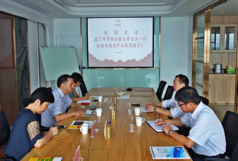根据市贸促会“不忘初心 牢记使命”主题教育活动总体部署,围绕精准服务外贸企业这一调研主题,7月3日,厦门市贸促会张全军会长、游毓红秘书长携商会秘书处走访金通达矿业集团,与苏建锋总经理、人力资源总监易震球进行座谈交流。