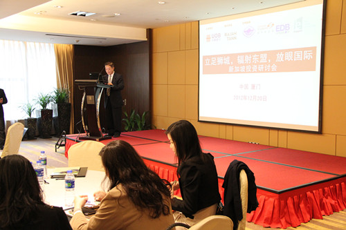 12月20日上午,新加坡大华银行在厦门泛太平洋大酒店举办“立足狮城,放眼国际”研讨会,厦门市贸促会/厦门国际商会作为支持单位积极参与该活动,组织了厦门国贸集团股份有限公司、厦门金龙联合汽车有限公司、厦门万里石股份有限公司3家国际商会副会长单位和11家有意向的理事会员企业参加了此次研讨会。我会刘长根副会长到会致辞。新加坡驻厦门总领事馆总领事罗德杰先生和厦门大华银行(中国)有限公司厦门分行行长黄莹女士对我会的支持表示感谢!