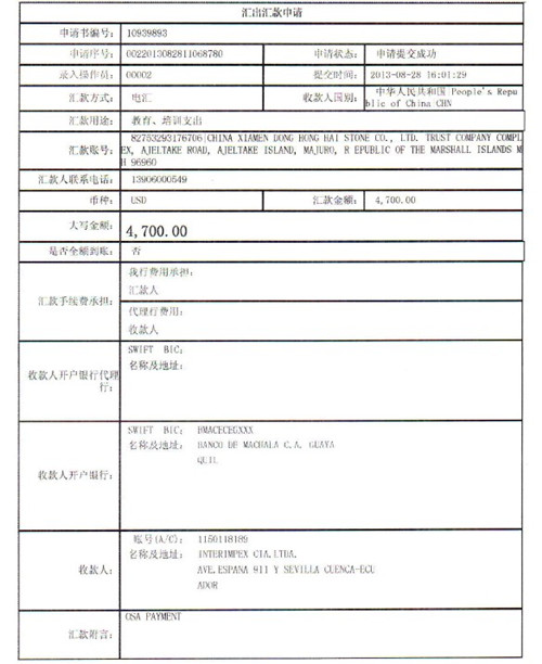 当即,我会调解员和Vintimilla先生、张女士一行来到案中离岸账户的公司——厦门某石材贸易公司。一开始该司负责人矢口否认该司有和任何厄瓜多尔贸易商的经济来往,称只做日本的客户。调解人员向该负责人出示了Vintimilla先生向该司转账的银行单据,经该司财务核实,确实收到此笔货款。该负责人才想起年初有个朋友曾跟他说要借用公司的离岸账户转一笔账的事宜。该司负责人当即电话与他的朋友核实,并表示愿意把这笔款项转还给Vintimilla先生。Vintimilla先生听高兴地说:只要转回4000美元即可,并邀请该司提供一些他需要的石材产品的报价。8月29日,该司全额转账4700美元到Vintimilla先生的账上,至此该调解案件圆满结束。