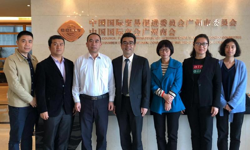 颜副会长一行拜会了广州市贸促会刘泽武副会长。刘副会长介绍了广州贸促会在自办展会方面工作,包括在境外举办的广州经贸周、广州名品展,及在广州举办的海丝国际博览会、食品展,并就在国际商会设独立行业委员会、与国外商协会互设联络处、针对海外人才的商务汉语培训等方面的经验进行分享交流。