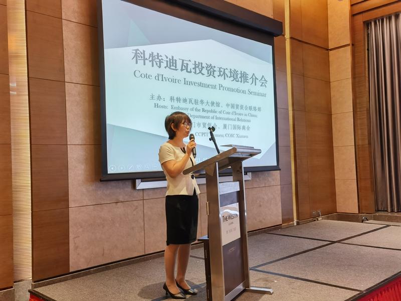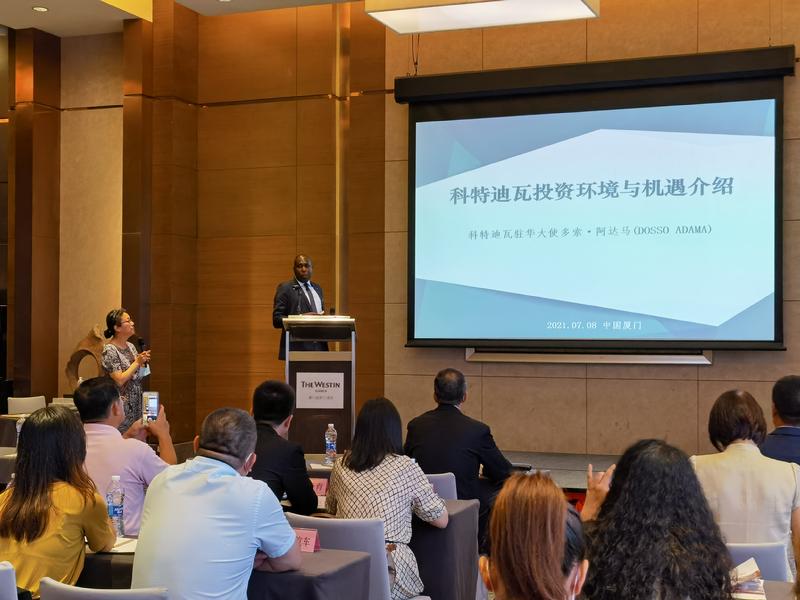 2021年7月8日,由科特迪瓦驻华大使馆和中国贸促会联络部联合主办,厦门市贸促会、厦门市国际商会承办的科特迪瓦投资环境推介会在厦门成功举办。科特迪瓦驻华大使多索·阿达马阁下、科特迪瓦驻华大使馆经济参赞博齐·布莱兹先生、中国贸促会联络部徐梁副部长、厦门市外办姚建洪副主任以及厦门市贸促会张全军会长、中国港湾工程责任有限公司代表虞剑等出席会议并发表演讲,会议由厦门市贸促会游毓红秘书长主持,共吸引来自厦门、深圳等地的近五十家企业代表参会。