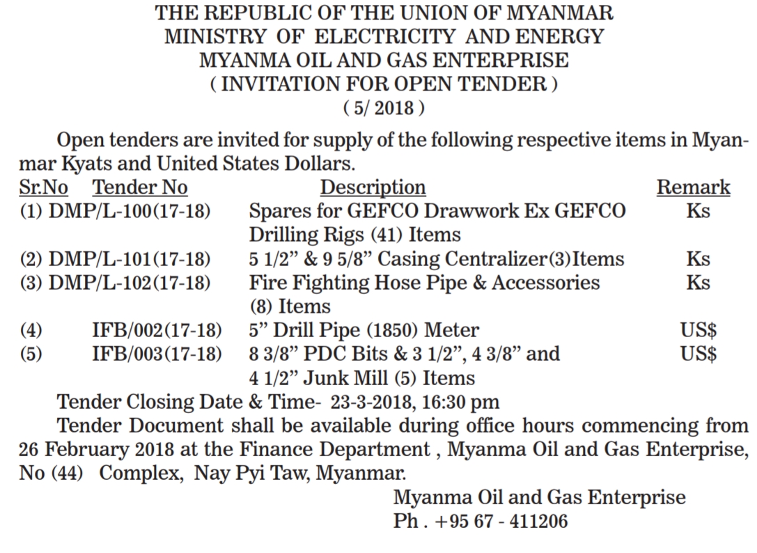 地址:Finance Department , Myanma Oil and Gas Enterprise,No (44) Complex, Nay Pyi Taw, Myanmar.