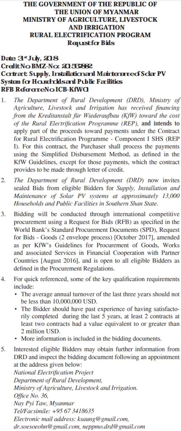 缅甸农业、牲畜和灌溉部农村发展司将利用德国复兴信贷银行提供融资的农村电气化项目相关资金,对掸邦南部的1.3万个家庭住户和公共设施的太阳能光伏电池供应、安装和维护进行招标。
