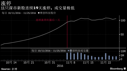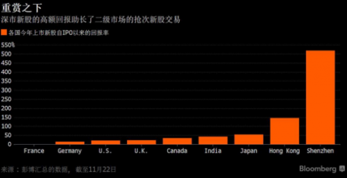 但是,在深市基准指数今年下跌7.8%的背景下,就算只买到一点次新股也总比颗粒无收要好。根据彭博汇编的数据,截至11月25日,在挂牌交易至少1个月的深交所新股中,若上市首日以涨停价入场,投资者获得的平均回报率可达366%。