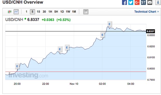 离岸人民币(CNH)兑美元跌幅超过400点或0.6%,刷新盘中纪录低点至6.8383。
