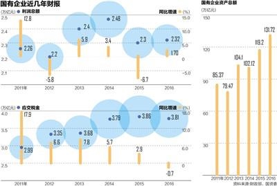 随着地方两会和地方国资委会议的密集召开,各省份都提出了今年国企改革的重点任务。以上海为例,2017年要完成2~3家竞争类集团整体上市或核心业务资产上市,推进5~10户符合条件的国有控股混合所有制企业试点员工持股。国务院国资委主任肖亚庆年初时部署了2017年国资国企改革的工作重点,其中首要任务是国有企业效益实现稳定增长。中央企业利润总额力争同比增长3%,努力达到6%。图为国有企业近几年财报数据。